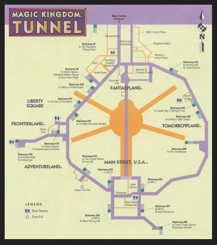 Why are there tunnels UNDER the Magic Kingdom in Orlando, Florida? Apparently, the park is built on the 2nd floor, the tunnels are at ground level, and the park is built on top of them. Disneyworld is huge and this map does not cover it all because there are more attractions there like Epcot Center and Universal Studios.