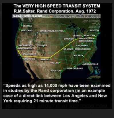 Are There are High Speed Trains Underground That Go Between Los Angeles and New York in 21 minutes?There have been rumors over the years that there are high speed trains underground that go all over the world. To better understand, there are trains that usesuspension technology and can reach speeds of up to 1,200 kilometers per hour (about 745 miles/hour). All galleries connect all the bases together. You come in from New York and you go out to Australia and from there to England. Everything underground, in great depth.